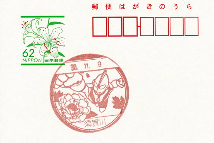 円谷プロダクションの創設者 円谷英二監督の出身地である須賀川市が、M78星雲光の国と姉妹都市になったことから、姉妹都市提携を記念して、「ウルトラマン」と須賀川市の花「牡丹」がデザインされています。郵頼申込先住所(局住所)