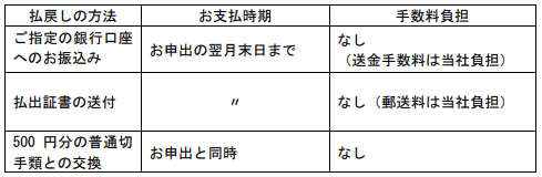 切手類の交換であれば即対応していただけますが、現金での払戻しとなると「郵便物等料金返還請求書兼受領証」を記載する必要がありますし、振り込まれるまでに1ヵ月ほどかかります。