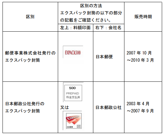 「EXPACK500」には、郵便事業株式会社発行のエクスパック封筒と日本郵政公社発行のエクスパック封筒の2種類がありますが、旧郵便事業株式会社が発行したものに限ります。