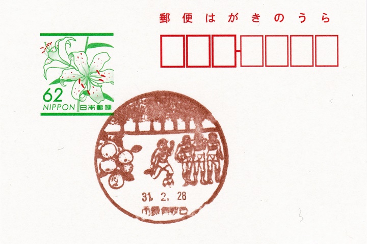 Jリーグサッカーチーム・「ジェフ市原」の地元であるので、サッカーと特産品の「梨」がデザインがされています。郵頼申込先住所(局住所)