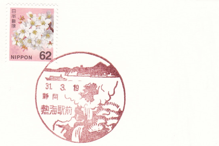 全国の風景印・小型印を収集して紹介!「熱海駅前郵便局」熱海駅前の間欠泉とお宮の松編。