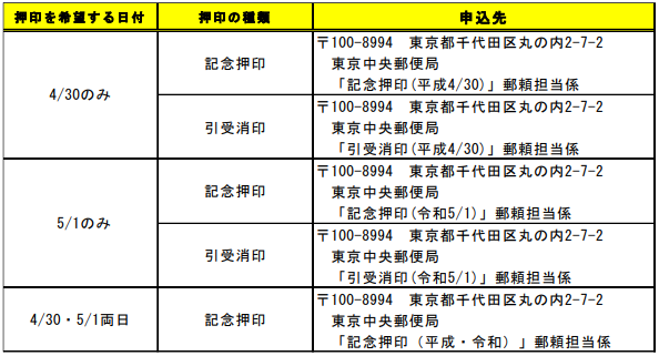 改元に伴って、平成最後となる4月30と令和初日となる5月1日は、記念押印が殺到すると思われます。