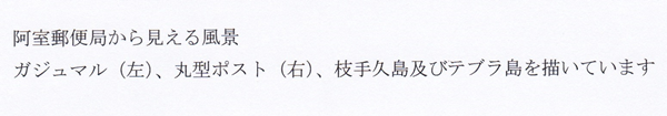 ガジュマル、丸型ポスト、枝手久島、テブラ島がデザインされています。