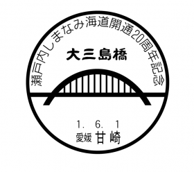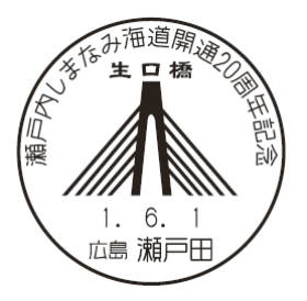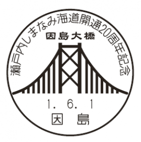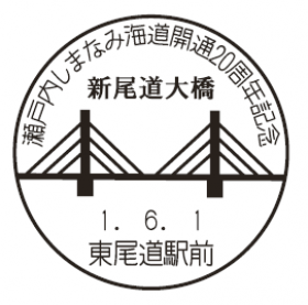 瀬戸内しまなみ海道開通20周年記念の小型印が、広島県尾道市・愛媛県今治市内の郵便局にて押印されます。