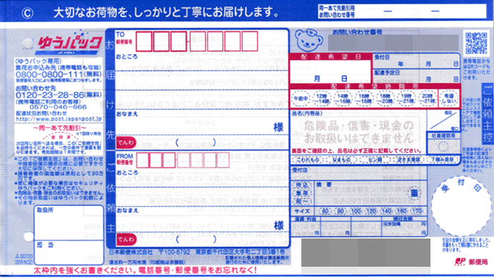 筆圧の影響で配達先の住所が見えなくて配達できない場合、具体的な内容品が不明な場合、荷物の破損・汚損など色々なトラブルが考えられますが、すぐに連絡できる電話番号さえ書いてあれば早急に対応する事ができますので、できるだけ電話番号は記載してください。