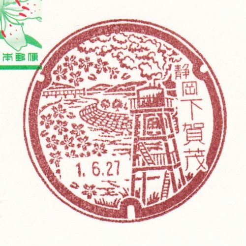 下賀茂区内にあるマンホールの蓋をベースに、下賀茂温泉の温泉やぐらと湯けむり、青野川沿いの早咲き桜がデザインされています。郵頼申込先住所(局住所)