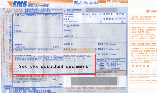 税関告知書補助用紙を利用する場合、下記のように内容品の項目に「See the attached document」と必ず記載してください。