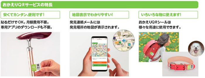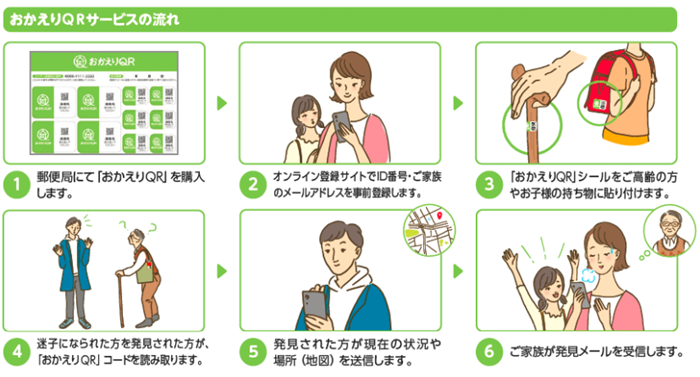 おかえりQRとは、ご高齢の方やお子様が迷子になられたときに、現在の状況や発見場所などを即時にご家族に伝え、迷子の早期発見をお手伝いするサービスです。