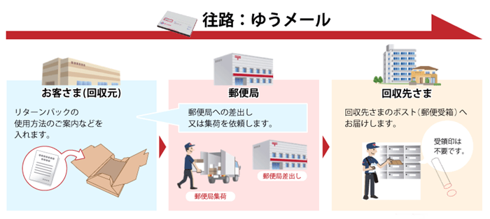 リターンパックを回収元にあらかじめご提供し、専用のゆうパック着払シート式伝票を貼付してゆうメールとして回収先に送付します。
